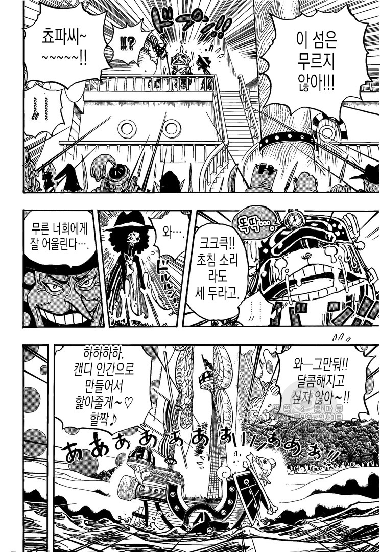 Perospero tells his subordinates to surround the coast with battleships. Nami says they can't escape by sailing out normally and prepares a coup de burst. However Perospero covers the ship in candy and prevents it.