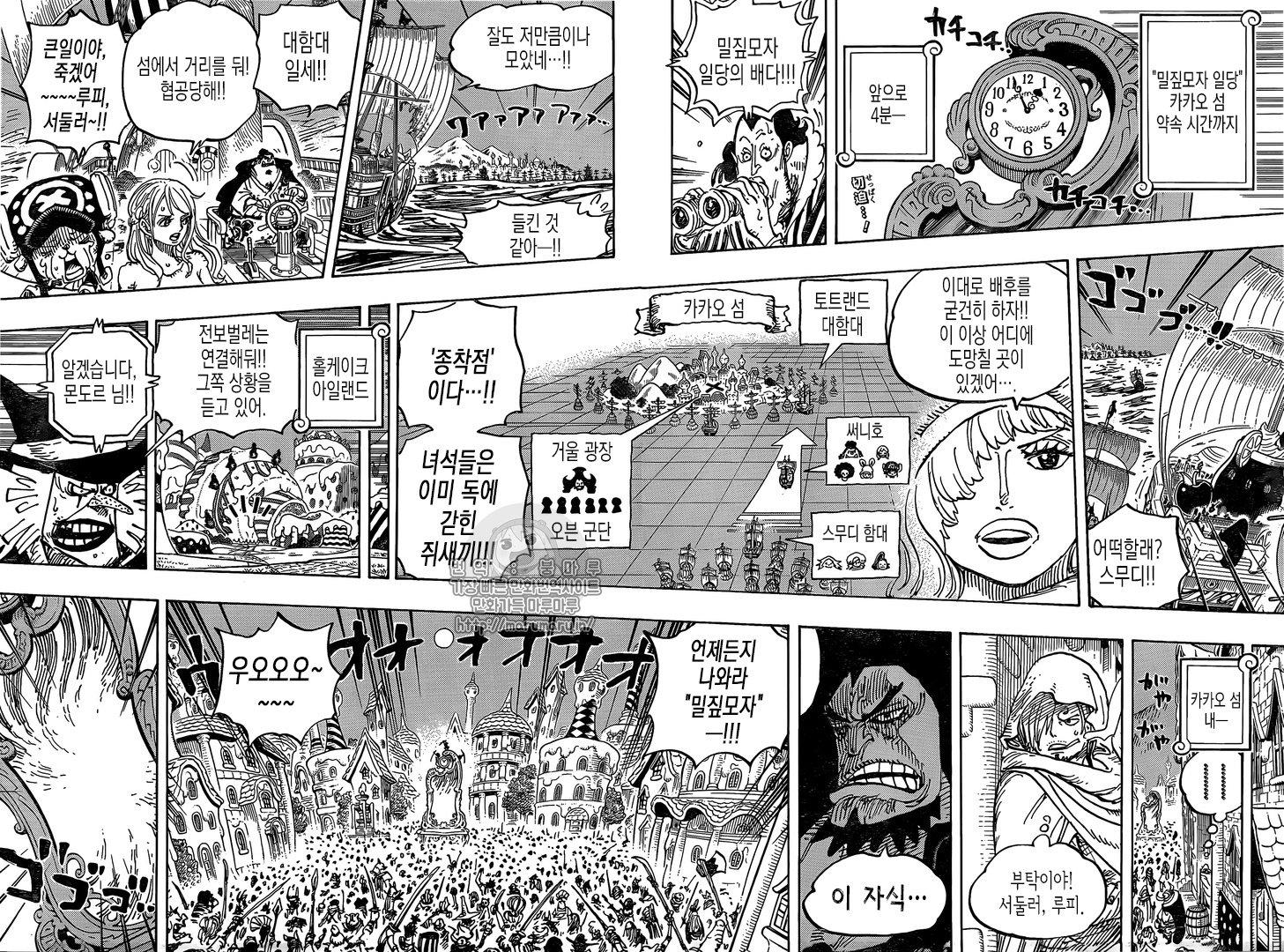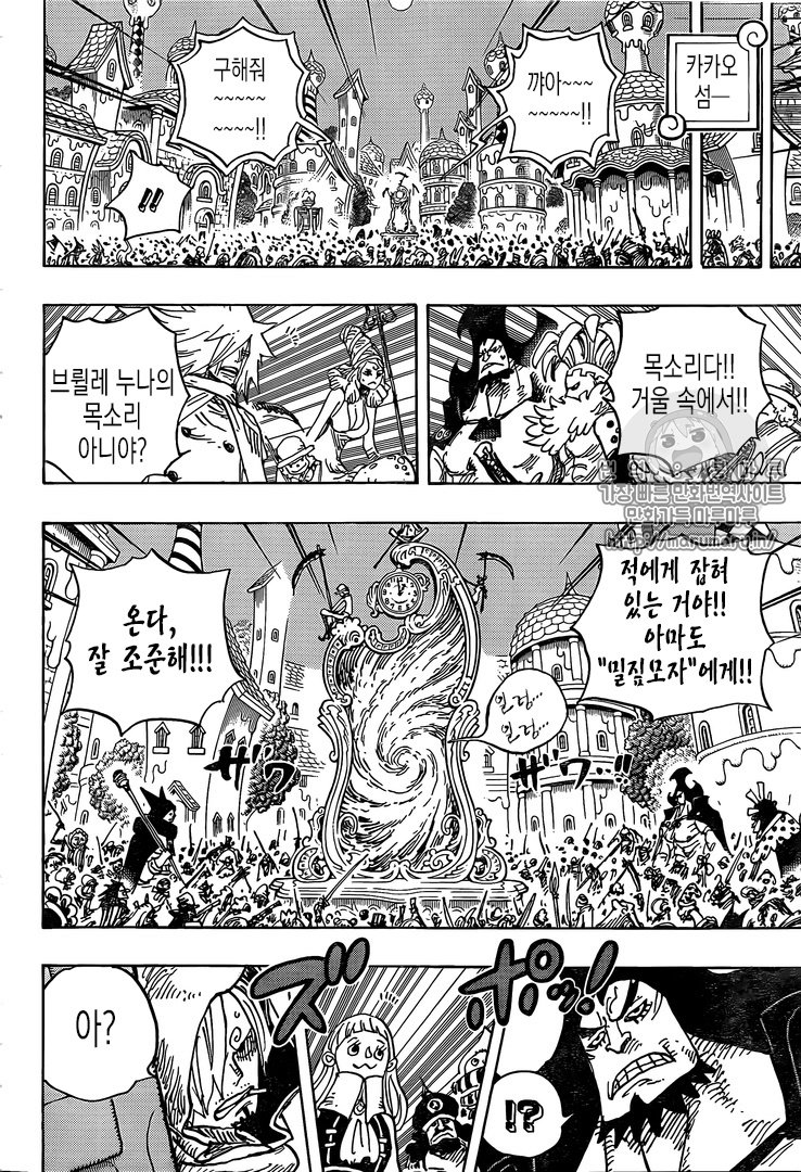 It's four minutes until the strawhats are assumed to meet up, and the Sunny is on the horizon. Smoothie orders they toughen security as they approach to keep the ship from escaping. Everyone anticipates Luffy to come out of the mirror, while inside Pekoms explains the "Sulong" form to Luffy, and howany he dd go into that form he'd lose his senses and become a mindless beast. But there was one person who could reach him, and that was Pedro. So basically Pedro was the only One who could bring him back to his senses. That's why he feels like he owes him. The plan is essentially for Pekoms to transform, run buck wild and let Luffy escape. Brulee calls this crazy since they've got enough forces to start a War waiting outside for them. Outside they can hear their voices from the mirror and prepare to shoot Luffy.Though it's Pekoms who comes out first surprising everyone. He's using Brulee as a shield so they can't attack right away. She begs for them to save her, but they're one sec too late as Pekoms takes off his glasses and looks at The moon.