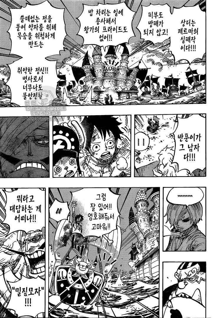 Judge doesn't speak to Sanji, and instead asks Luffy how he could boldly walk into the territory of one of the yonkou just to save one person. He basically goes on about how Sanji's a failure and only good for cooking saying he has no pride as royalty. Luffy looks surprised --at first impression because he didn't know this about Sanji's past, but then he just thanks Judge for helping them leave and giving them back up. Totally ignoring Judge's question and pissing him off. He misunderstood Judge's words --he thought he was complimenting Sanji. Unfortunately they're completely surrounded now, and there's no way to escape. Daifuki attacks the mast and Carrot, but Sanji wards him off.